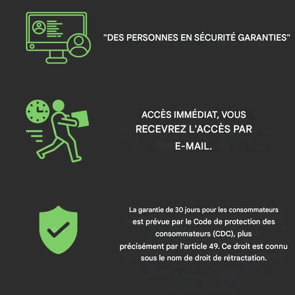 Après l’achat, vous bénéficiez d’une garantie de remboursement de 30 jours.